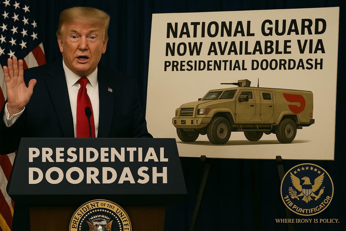 WASHINGTON, D.C. – In a bold leap forward for executive overreach and logistics innovation, President Trump has quietly rolled out Presidential DoorDash; a new on-demand military delivery service that sends troops directly to your doorstep, no state request necessary.