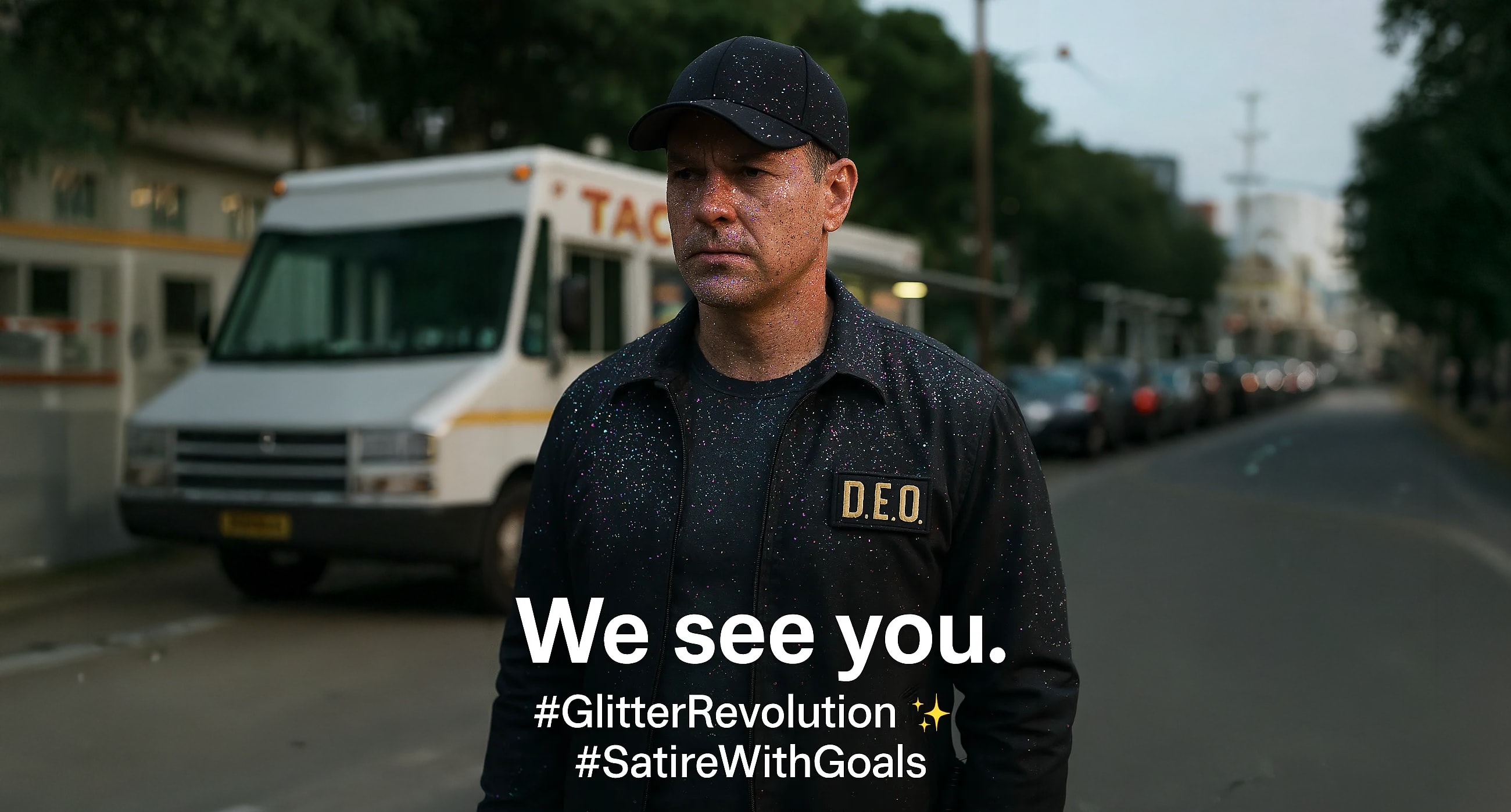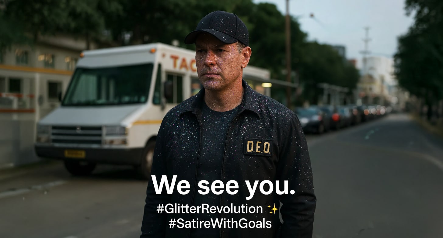 LOS ANGELES, CA – It began, as all revolutions do, on TikTok. User @ShimmerForJustice posted a now-viral video of what appeared to be a plainclothes ICE agent covered in iridescent specks and shame outside a taco truck in Echo Park. The caption read simply: “We see you. ✨ #GlitterRevolution #SatireWithGoals”
