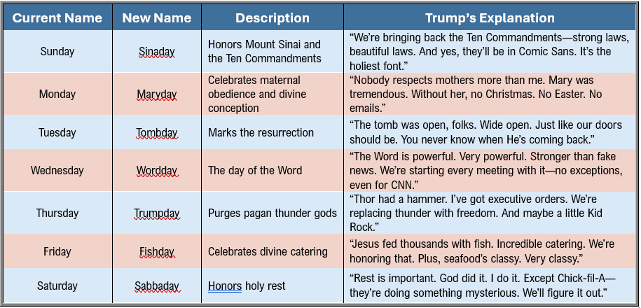 In a bold move to “restore biblical purity to the American calendar,” President Donald Trump signed a new executive order today declaring that Thursday will be renamed Trumpday, effective immediately, citing concerns that the current name forces Christians to “worship the false idol named Thor.” The remaining days of the week are scheduled to be renamed on January 1, 2026.