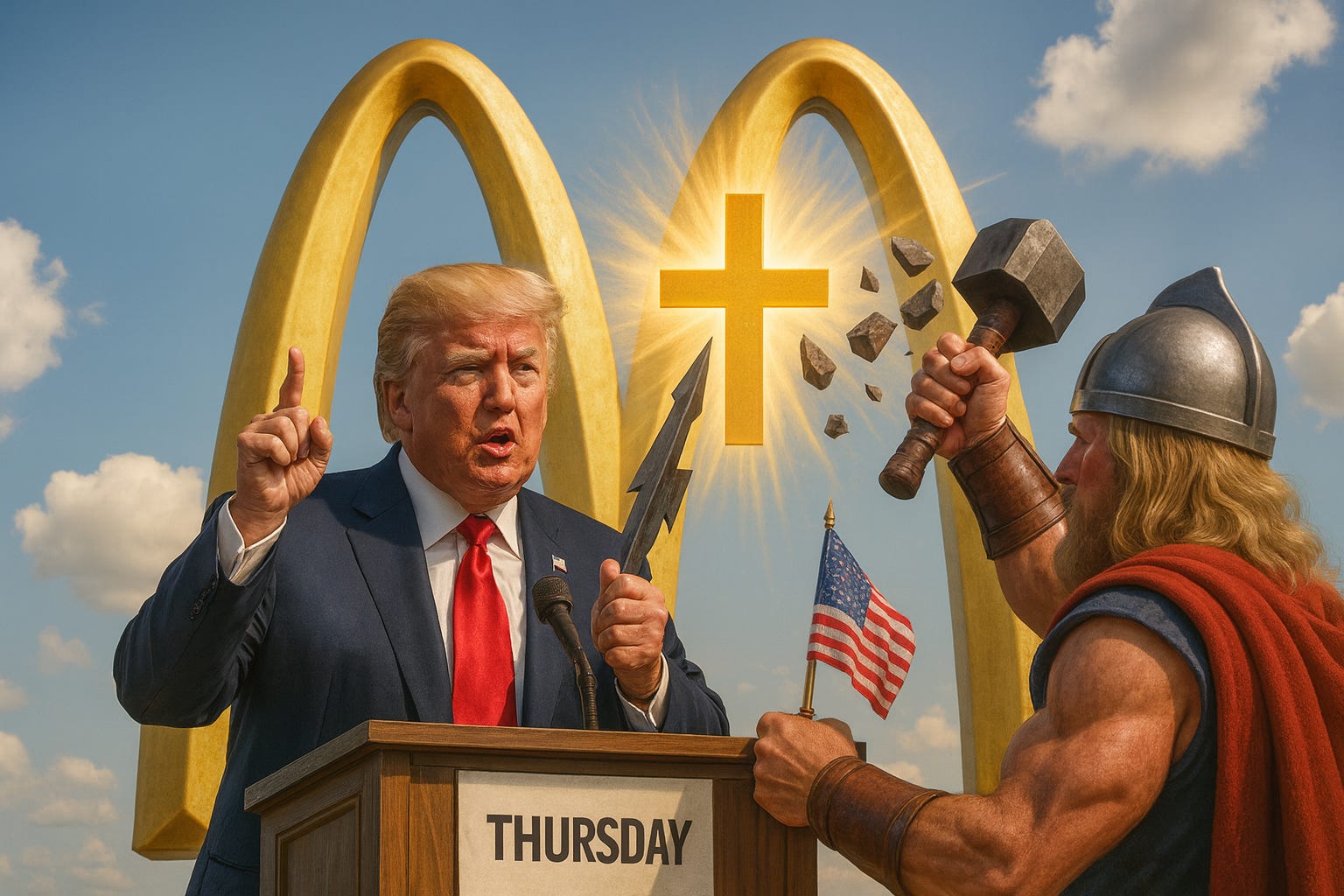 “People don’t even know this, but every single Thursday—millions of Christians, great people, they’re unknowingly worshipping a pagan thunder god. It’s true. It’s called Thor. Very bad guy,” Trump said during a press conference held beneath a double golden arch, flanked by a 30-foot LED mural of himself smashing Thor’s hammer with a glowing cross. “We’re changing that. We’re restoring biblical purity to the American calendar, which frankly, has been a total disaster since the Romans got involved. Total disaster. It’s disgraceful. We’re going to fix it. We’re going to make calendars great again.”