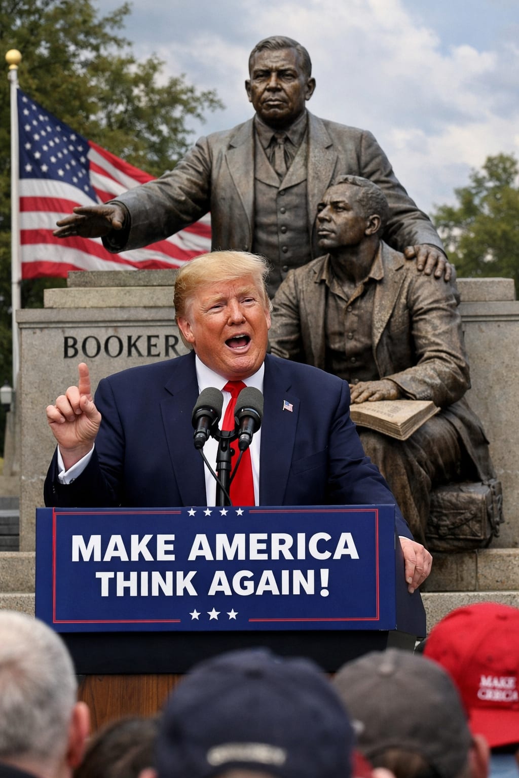 WASHINGTON, DC — In a ceremony that park officials described as “surprisingly loud” and “architecturally reckless,” President Trump signed an executive proclamation Monday officially renaming the historic Booker T. Washington Memorial to the “The Booker T. Washington – President Donald J Trump National Memorial Heritage Legacy Experience & Visitor Synergy Plaza Presented in Partnership with Trump Inc.”, insisting the new title “honors both great men equally.”