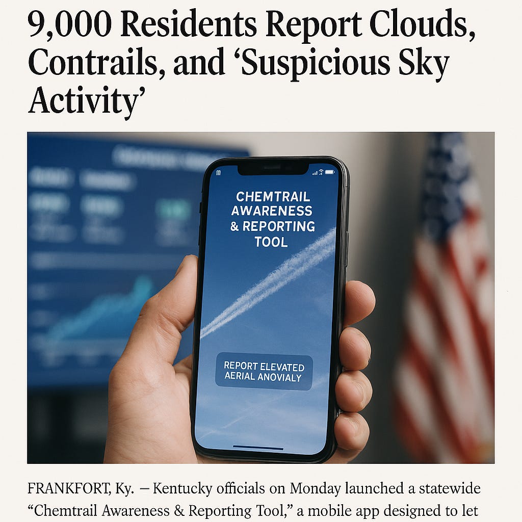 Kentucky officials on Monday launched a statewide Chemtrail Awareness and Reporting Tool, a mobile app allowing residents to document what the state describes as “aerial anomalies” and “unregistered sky streaks.” Within hours, more than 9,000 reports were submitted, overwhelming the system.